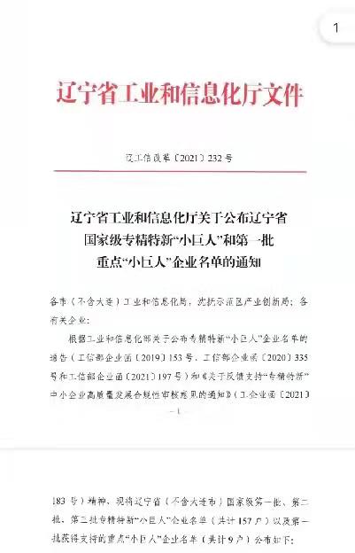 辽宁省工业和信息化厅关于公布辽宁省*********专精特新“小巨人”和第一批重点“小巨人”企业名单的通知